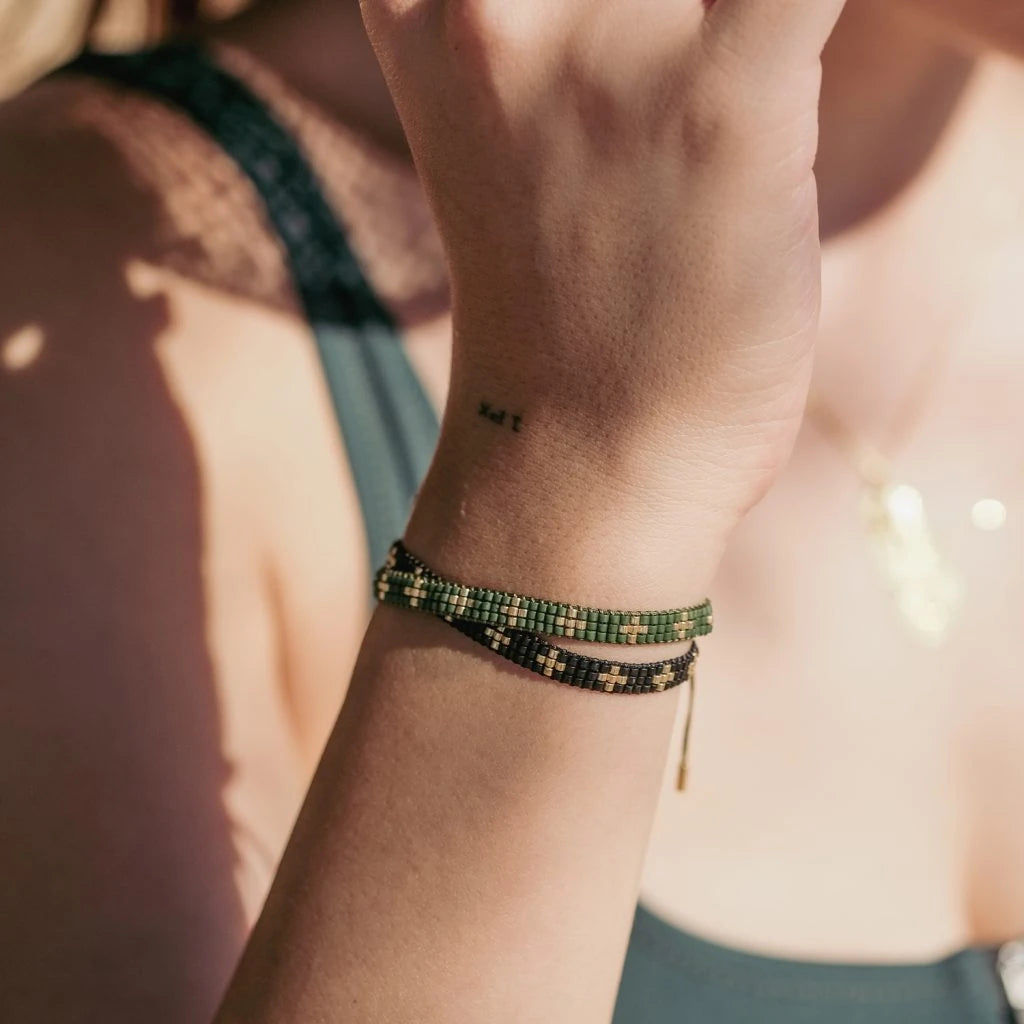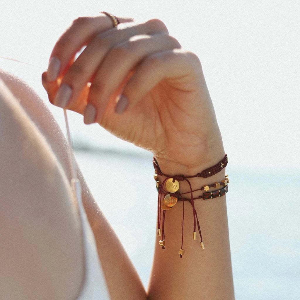 Boom bileklikler cam boncuklar ile elde dikilerek üretilir. Ayarlanabilir kordonu sayesinde farklı bilek kalınlıklarına uyum sağlar.