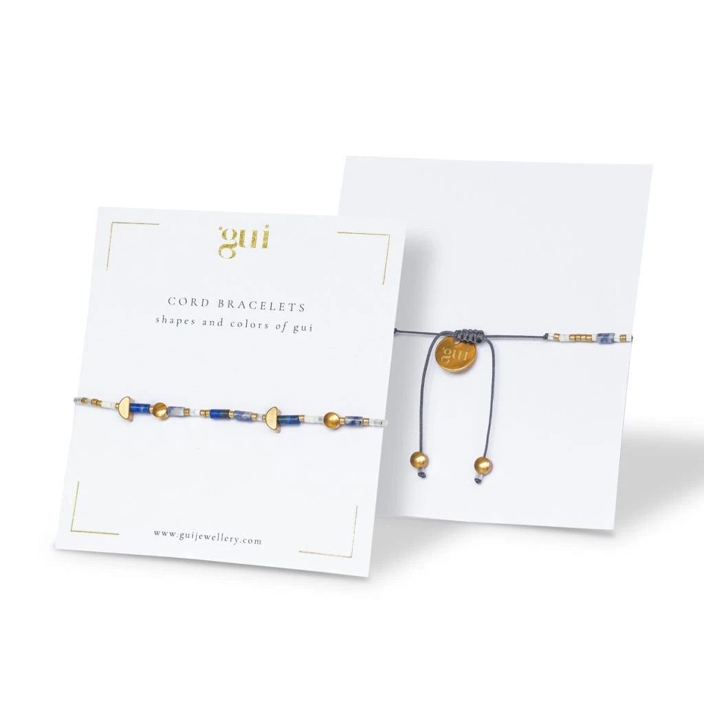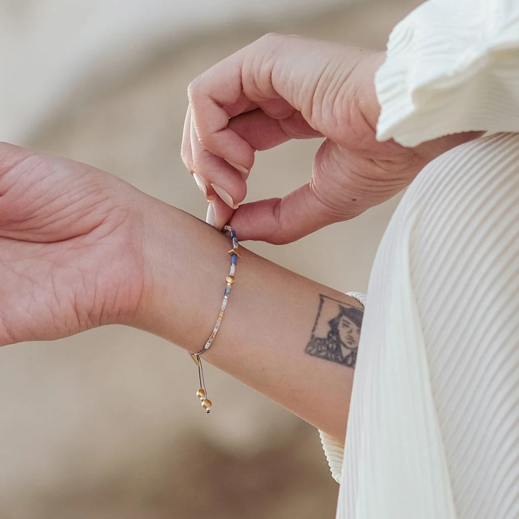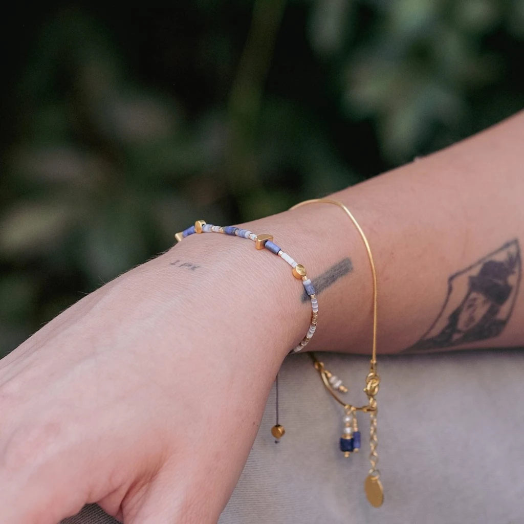 Lapis bileklikte, Lapis Lazuli ve Sodalit doğal taşlarının yanı sıra 18 ayar altın kaplamalı pirinç döküm boncuklar ve cam kesim boncuklar bulunmaktadır. Ayarlanabilir kordonu sayesinde farklı bilek kalınlıklarına uyum sağlar.