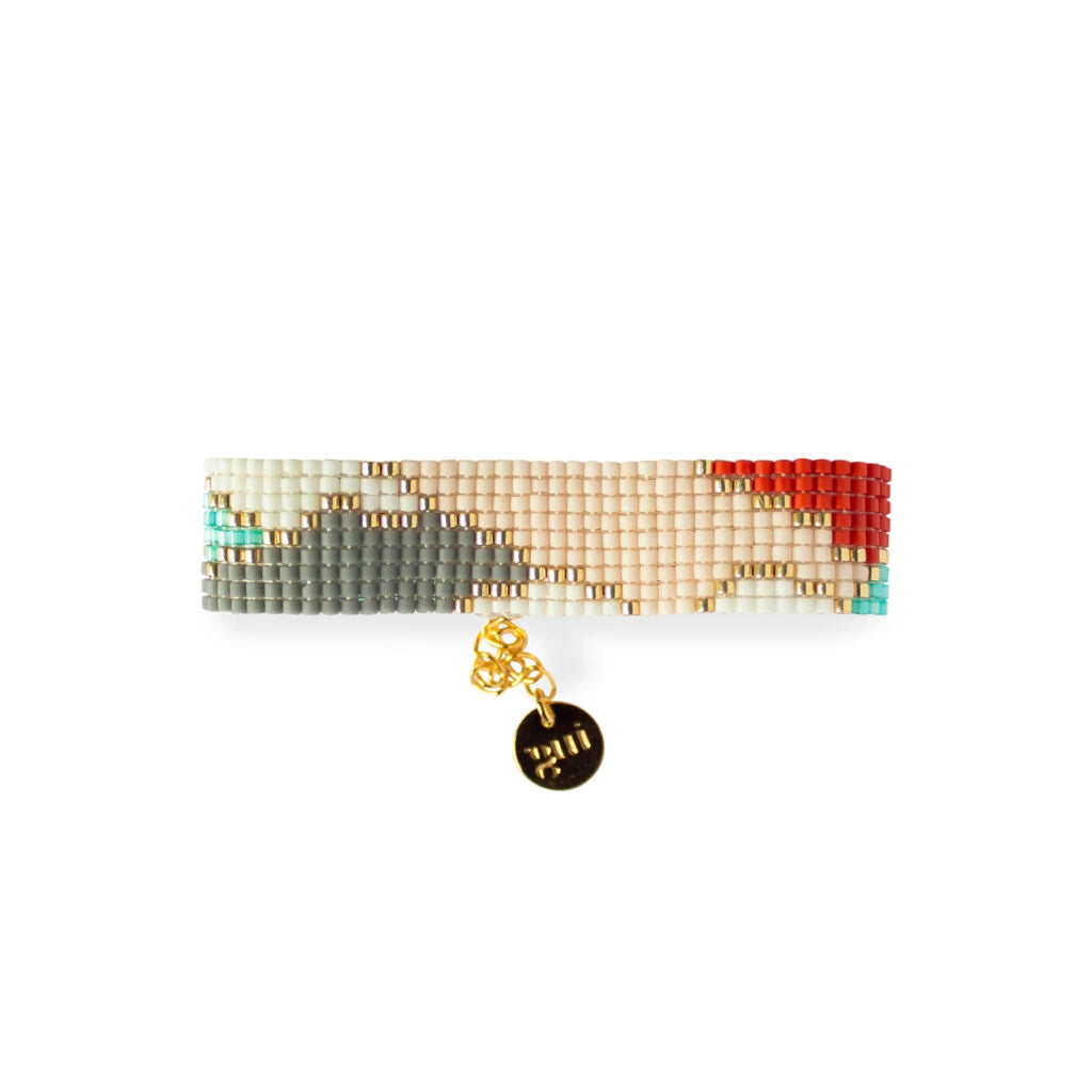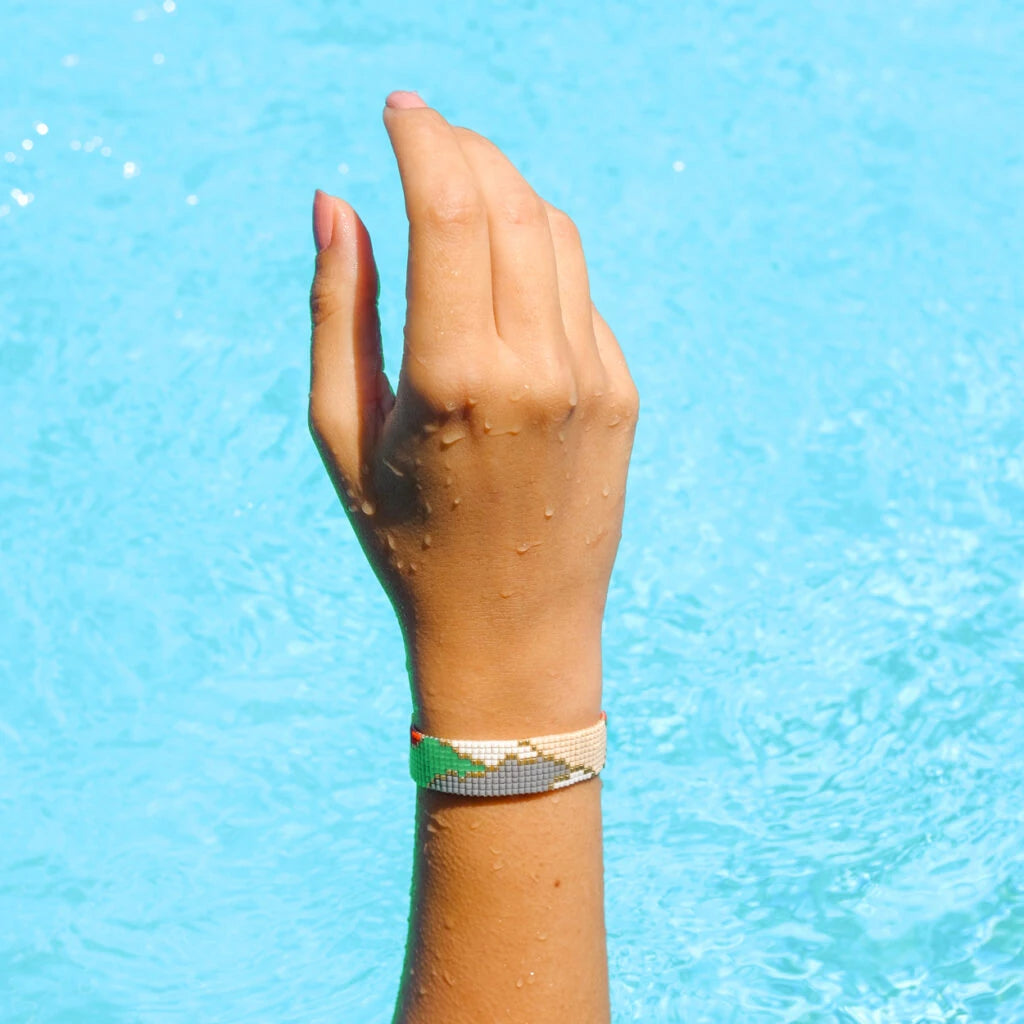 Wave bileklik, cam boncuklar ile dikilerek üretilir. Her parça, en yüksek el yapımı kalitesine ulaşmak için yetenekli zanaatkarlarımız tarafından özenle işlenmiştir. Bileklik kilitleri pirinç üzerine 18 ayar altın kaplamadır. Bitimindeki zincir ile farklı bilek kalınlıklarına uyum sağlar.