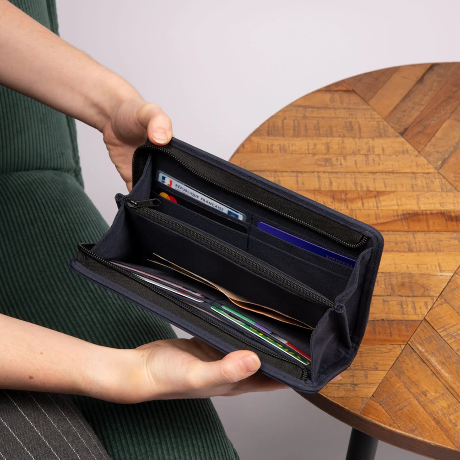 Cüzdan, pasaport, kimlik kartı ve ehliyet gibi belgeler için özel bölmelere sahiptir. Fermuarlı kapama mekanizması, güvenli bir kullanım sağlarken, iç kısmında bulunan fermuarlı cep bozuk paralar için idealdir. Düz cep, kağıt paraların düzenli bir şekilde saklanmasına olanak tanırken, toplamda 10 adet kart yuvası ile kullanıcıların ihtiyaçlarını karşılar.