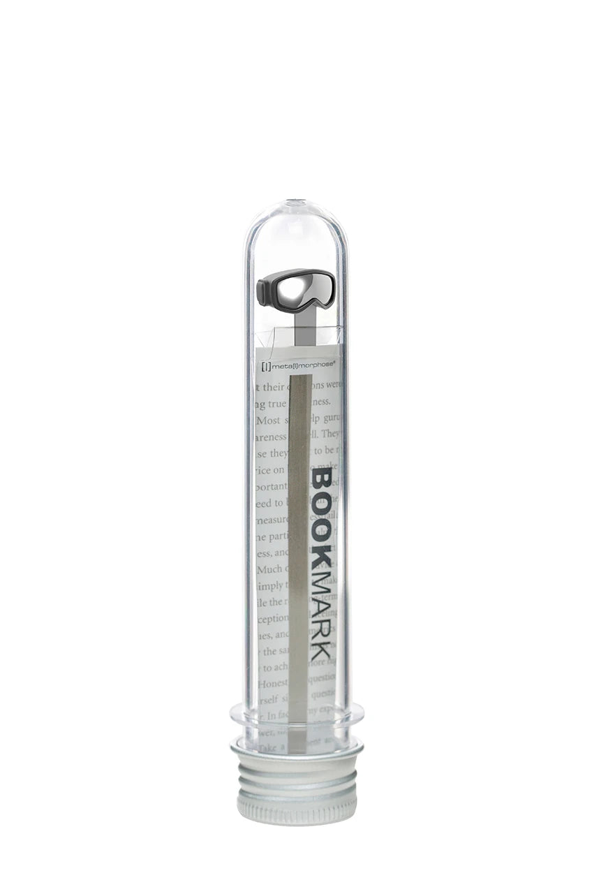 Meta [l] morphose® Kitap Ayracı - Akrilik Tüp Ambalajı - Kış kayak gözlüğü tasarımı - Parlak krom gözlük simülasyonlu siyah boya - Telif hakkı tescilli tasarım