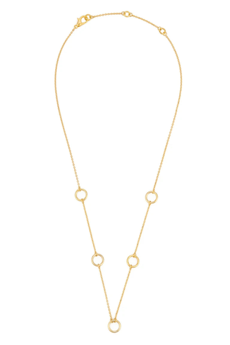 Dengeyi ve uyumu sembolize eden dairesel halkalarla tasarlanan Karma Gold Kolye, sade ama etkileyici bir duruş sunar. V formundaki zincir üzerine yerleştirilen simetrik halkalar, boyun hattını zarifçe vurgular. Pirinç üzeri altın kaplamasıyla ışıltılı bir görünüm sunan bu kolye, hem tek başına hem de katmanlı kombinlerde kusursuz durur.