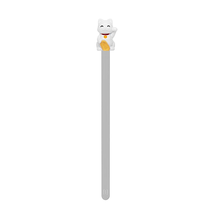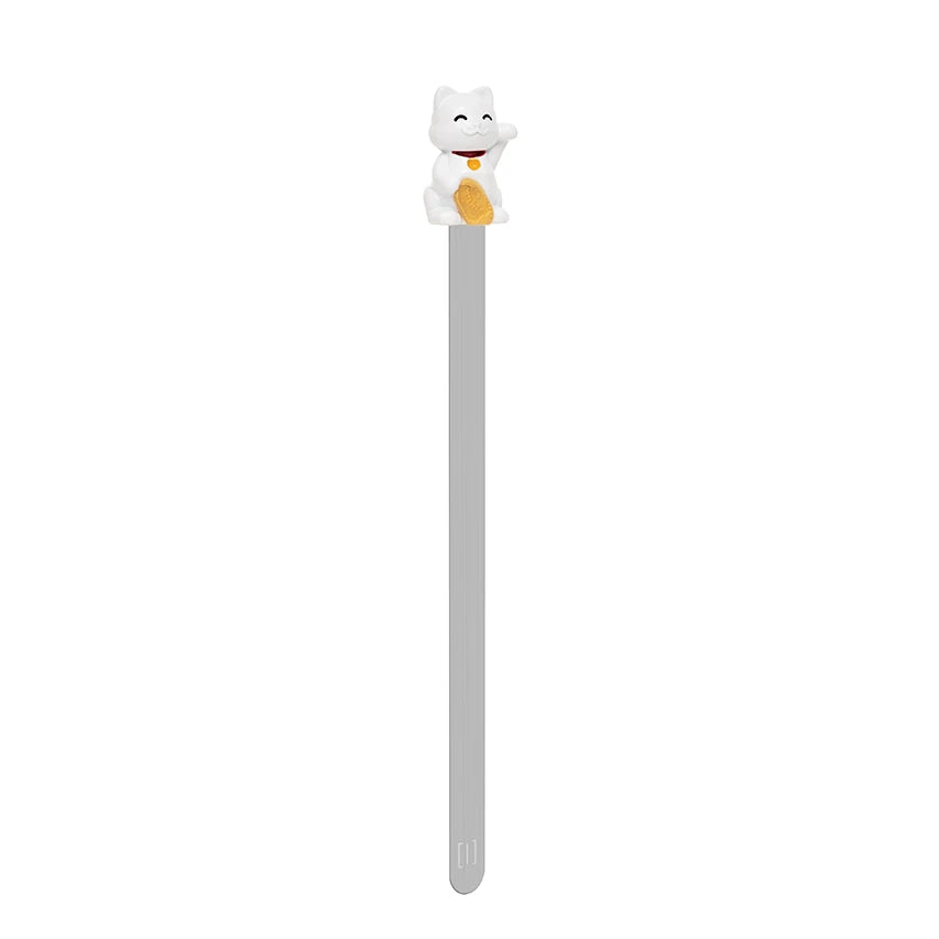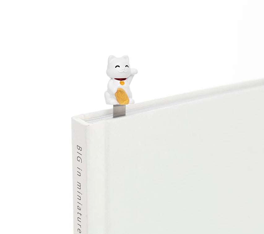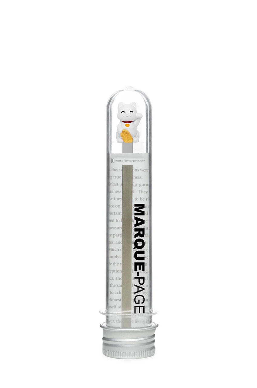Meta [l] morphose® Kitap Ayracı - Akrilik Tüp Ambalaj - Şanslı kedi - beyaz boya/altın kaplama ve silikon kolye - telif hakkı kayıtlı tasarım