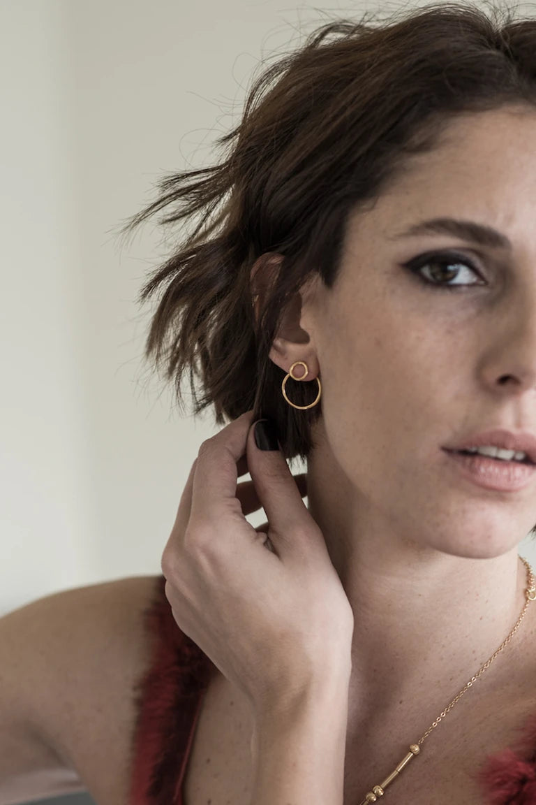 Circle Jacket Küpe, üst üste geçen iki farklı halka formuyla hem klasik hem de modern çizgileri bir araya getiriyor.