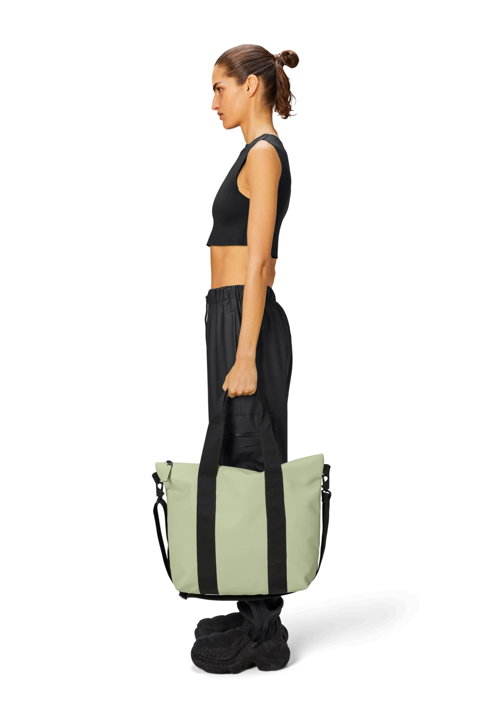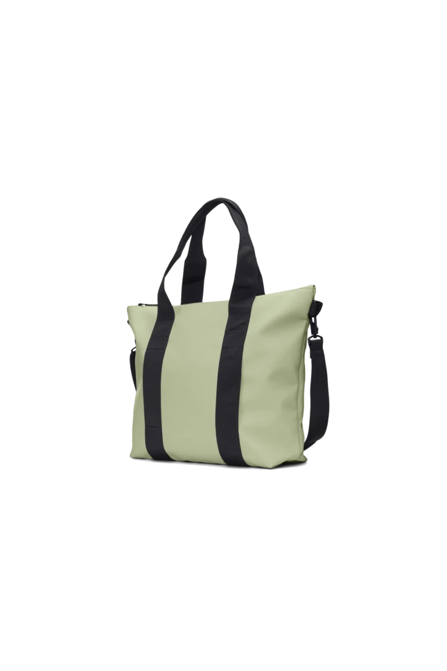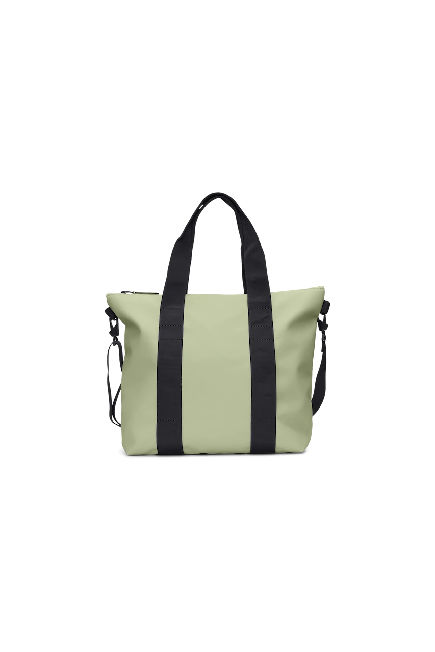 Totebag Mini, Rains klasiği Totebag'in küçültülmüş bir versiyonudur. Rains'in özel su geçirmez kumaşından kesilen tasarım, her türlü hava koşulunda kullanımı kolay bir temel sunar. Kaplamalı bir fermuar, altından saran dokuma kulplar ve çıkarılabilir omuz askısı ile tamamlanmıştır.